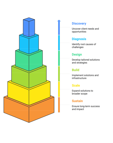 We partner closely with leadership teams to move deliberately through discovery and diagnosis, design and execution, and ultimately scale what works — embedding capabilities so value continues long after the initial engagement.